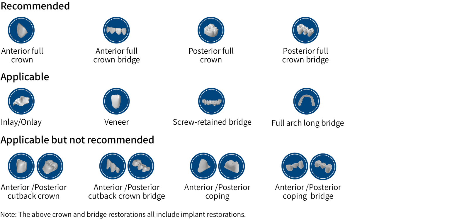 - دواعي الاستخدام: "مناسبة لمجموعة واسعة من دواعي الاستخدام، من التيجان الفردية إلى هياكل الجسور المكونة من 14 وحدة." "تشمل الفينير، الحشوات الداخلية (inlays)، والتيجان الأمامية والخلفية، جسور التيجان الكاملة، جسور كاملة المحيط مثبتة بمسامير، وترميمات مدعومة بالزرعات."