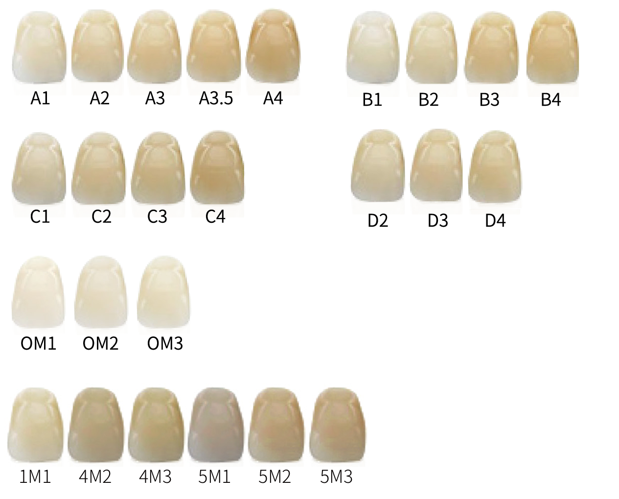 - نطاق الظلال: "متوفر بـ 16 ظلاً من دليل ألوان VITA® الكلاسيكي و 3 ظلال تبييض (OM1، OM2، OM3)." "تتوفر أيضًا ظلال إضافية شائعة من دليل ألوان VITA® 3D master (1M1، 4M2، 4M3، 5M1، 5M2، 5M3)."