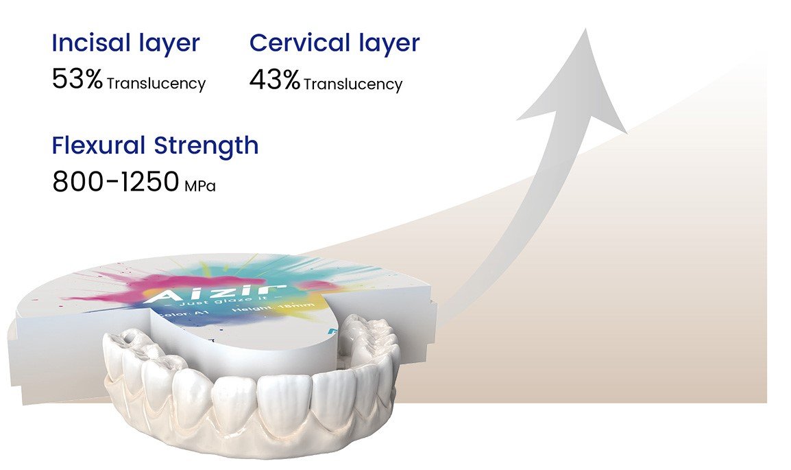 Aidite Aizir هي زركونيا متعددة الطبقات تتميز بتركيبات مختلفة لطبقتيها القاطعة (5Y-TZP) والعنقية (4Y-TZP). يخلق هذا التصميم تدرجًا لونيًا طبيعيًا ومقدارًا مثاليًا من القوة والشفافية ينتقل من مناطق عنق السن إلى مناطق القاطعة في الترميم.”