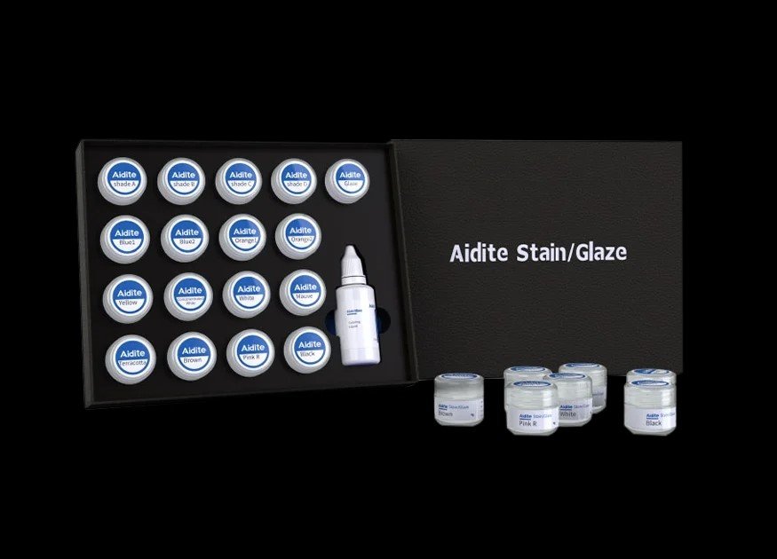 Aidite Stain/Glaze هو نظام معاجين تلوين وتزجيج خارجية مصمم لتعزيز جماليات ترميمات الأسنان السيراميكية. وظيفته الرئيسية هي محاكاة ألوان الأسنان الطبيعية وتوفير لمسة نهائية متينة وجمالية.”