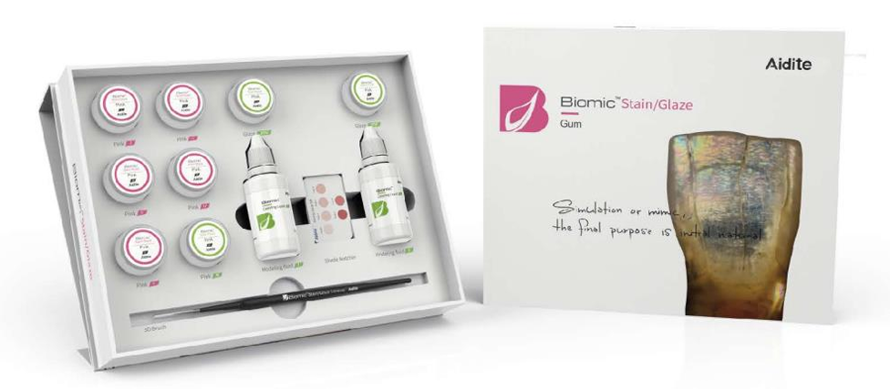 “Biomic Stain/Glaze هو نظام شامل يستخدم للتلوين والتزجيج الشامل لجميع أنواع ترميمات الأسنان السيراميكية، بما في ذلك الزركونيا، السيراميك الزجاجي، والبورسلين. كما يتضمن مجموعة متخصصة لإنشاء جماليات لثة ذات مظهر طبيعي